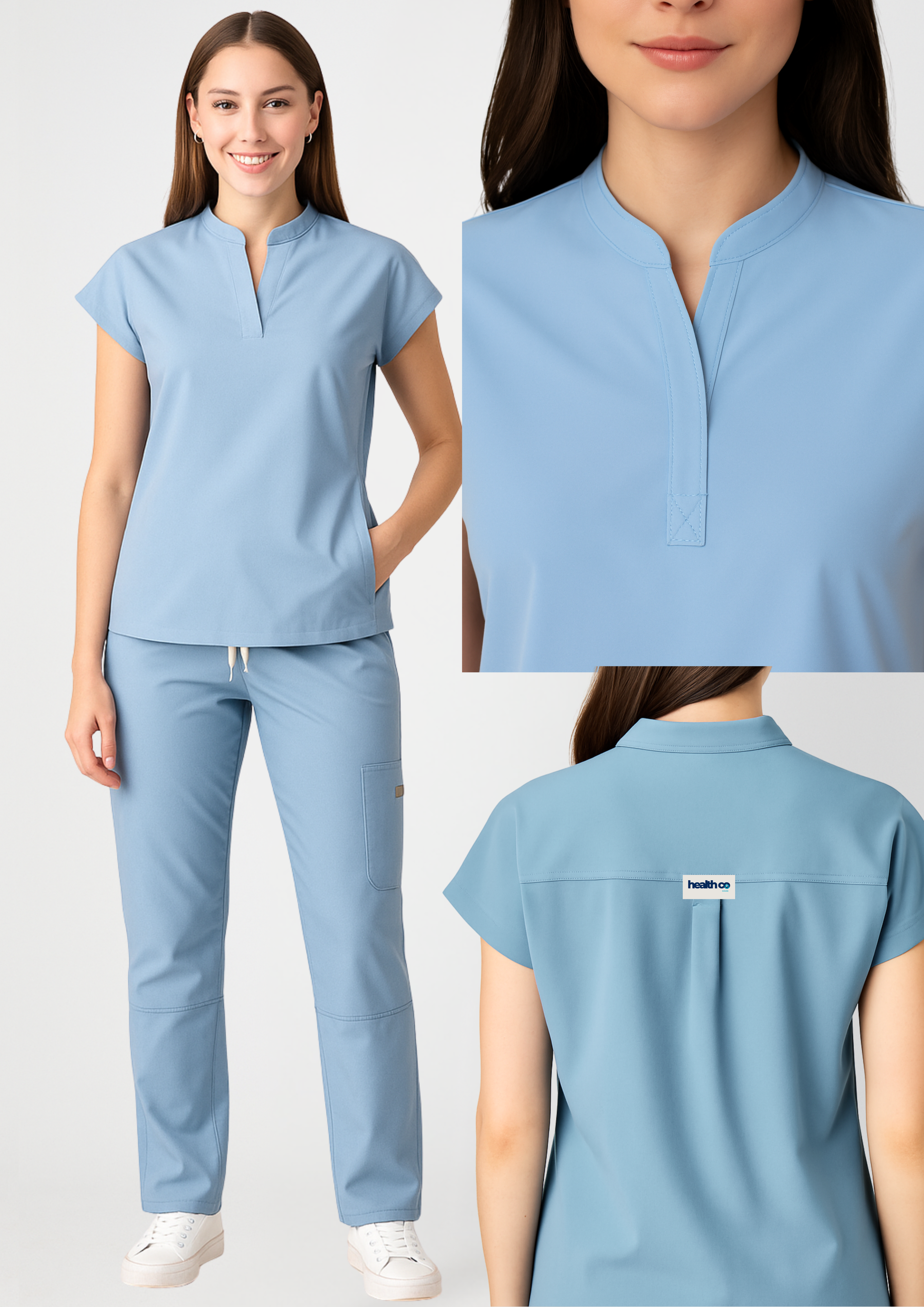 Scrub con blusa oversized con cuello tipo militar y dos bolsillos invisibles para un look minimalista y funcional. Pantalón de bota ancha con diseño moderno, incluye dos bolsillos laterales, uno práctico en la rodilla y dos en la parte trasera para mayor versatilidad y comodidad en el día a día.