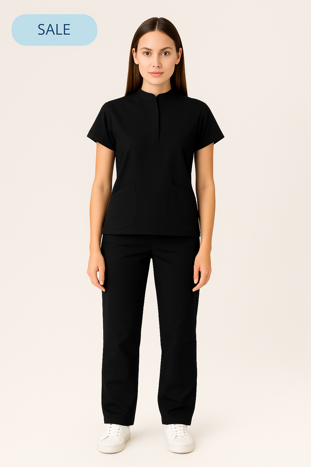 Scrub con blusa con cuello tipo kimono y dos bolsillos invisibles para un look minimalista y funcional. Pantalón de bota ancha con diseño moderno, incluye dos bolsillos laterales, uno práctico en la rodilla y dos en la parte trasera para mayor versatilidad y comodidad en el día a día.