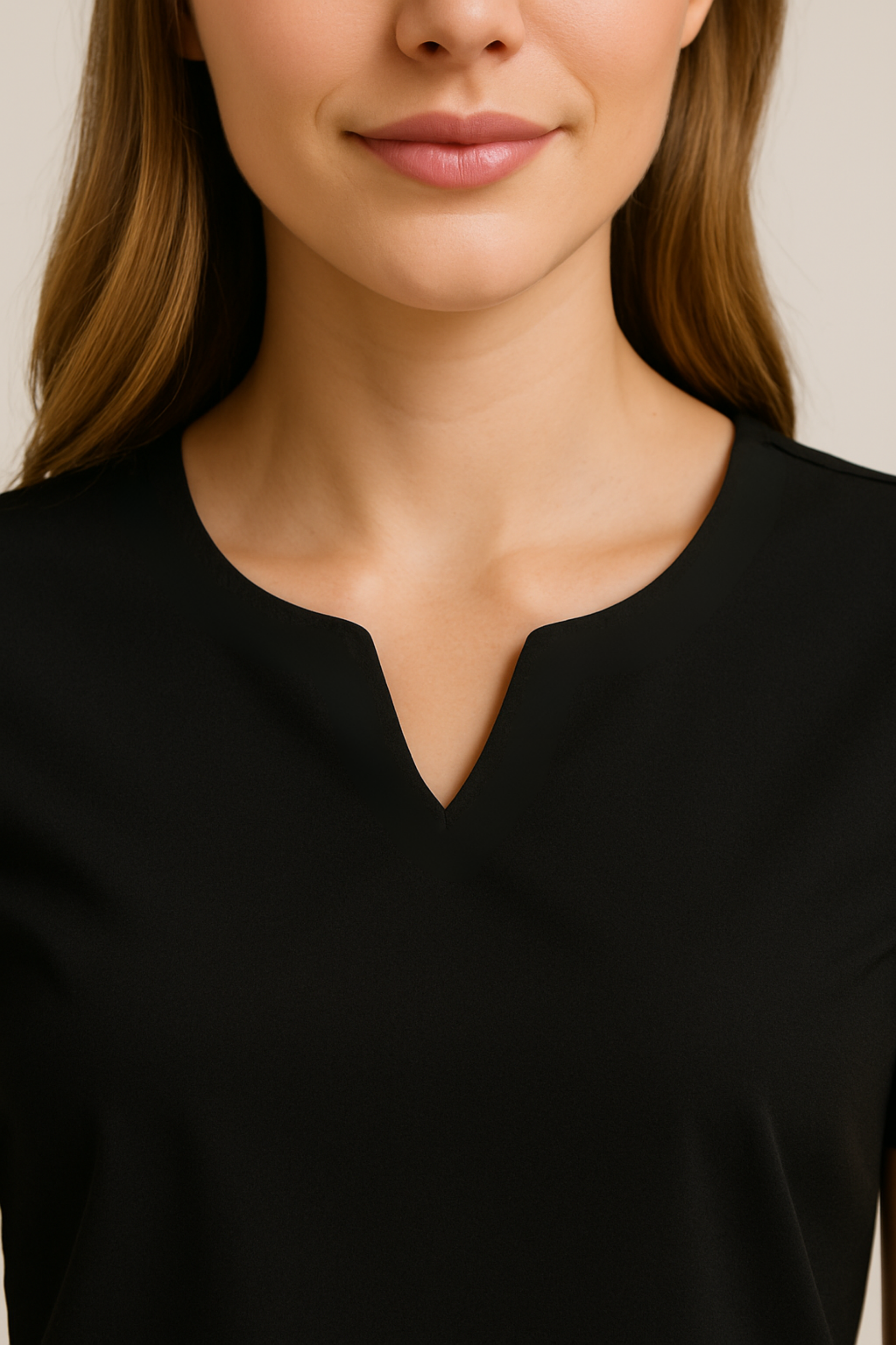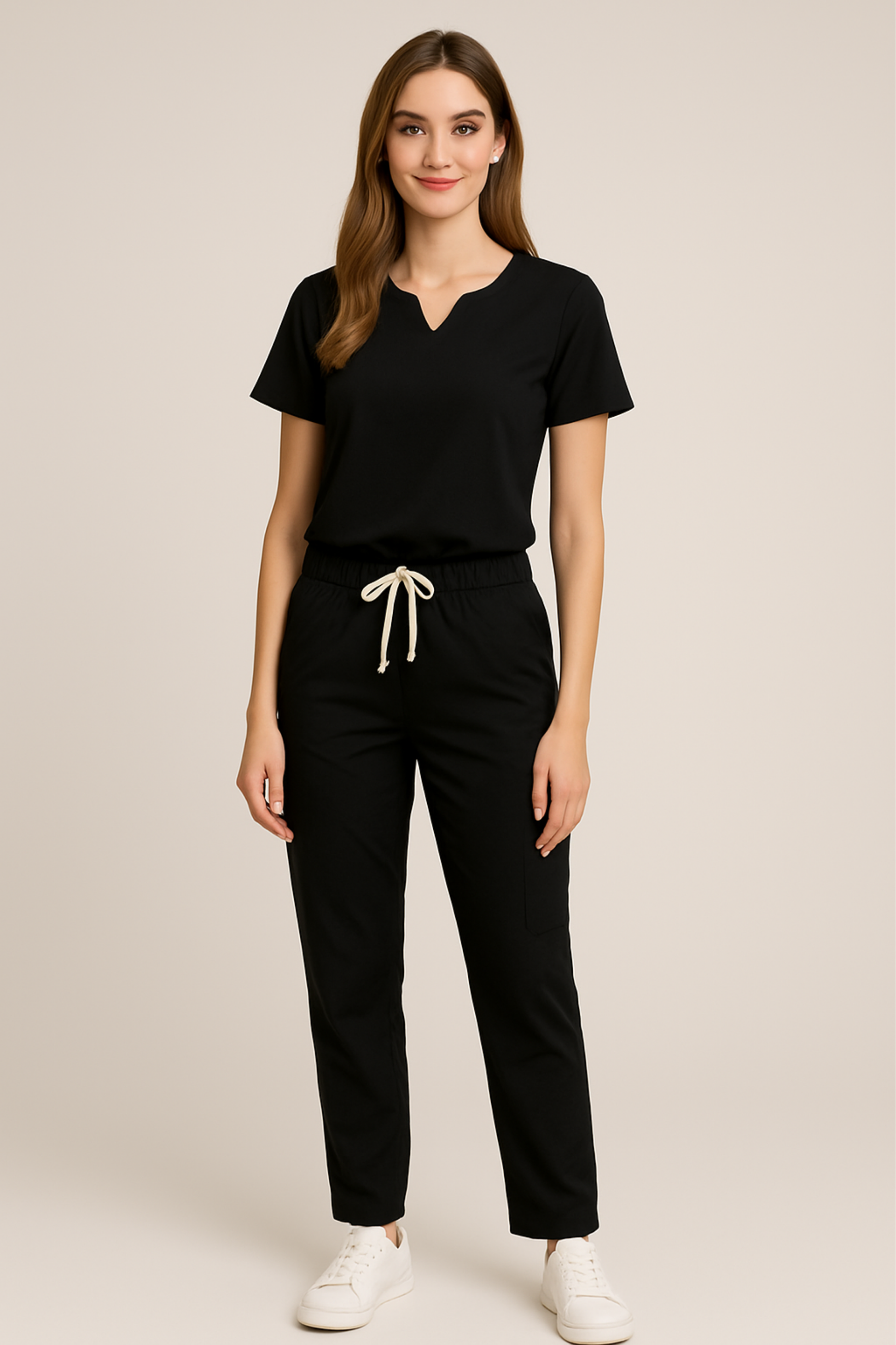 Scrub con blusa de cuello con V pequeña, pantalón con dos bolsillos laterales, dos bolsillos en media pierna y dos bolsillos traseros, cintura resortada con cordón. Pantalón high waisted (tiro alto)