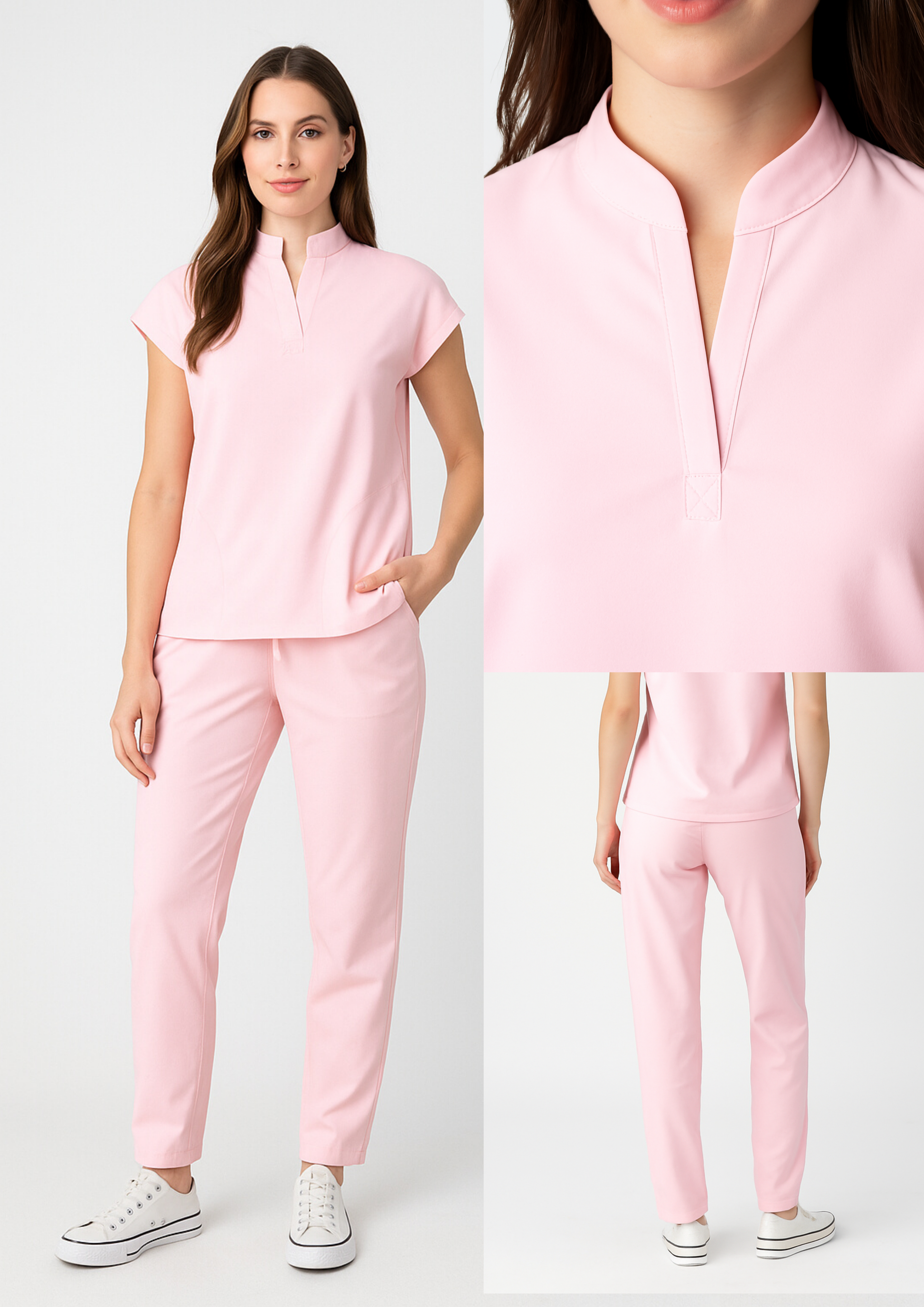 Scrub con blusa con cuello militar con manga tipo kimono, pantalón con dos bolsillos laterales y cintura resortada con cordón.