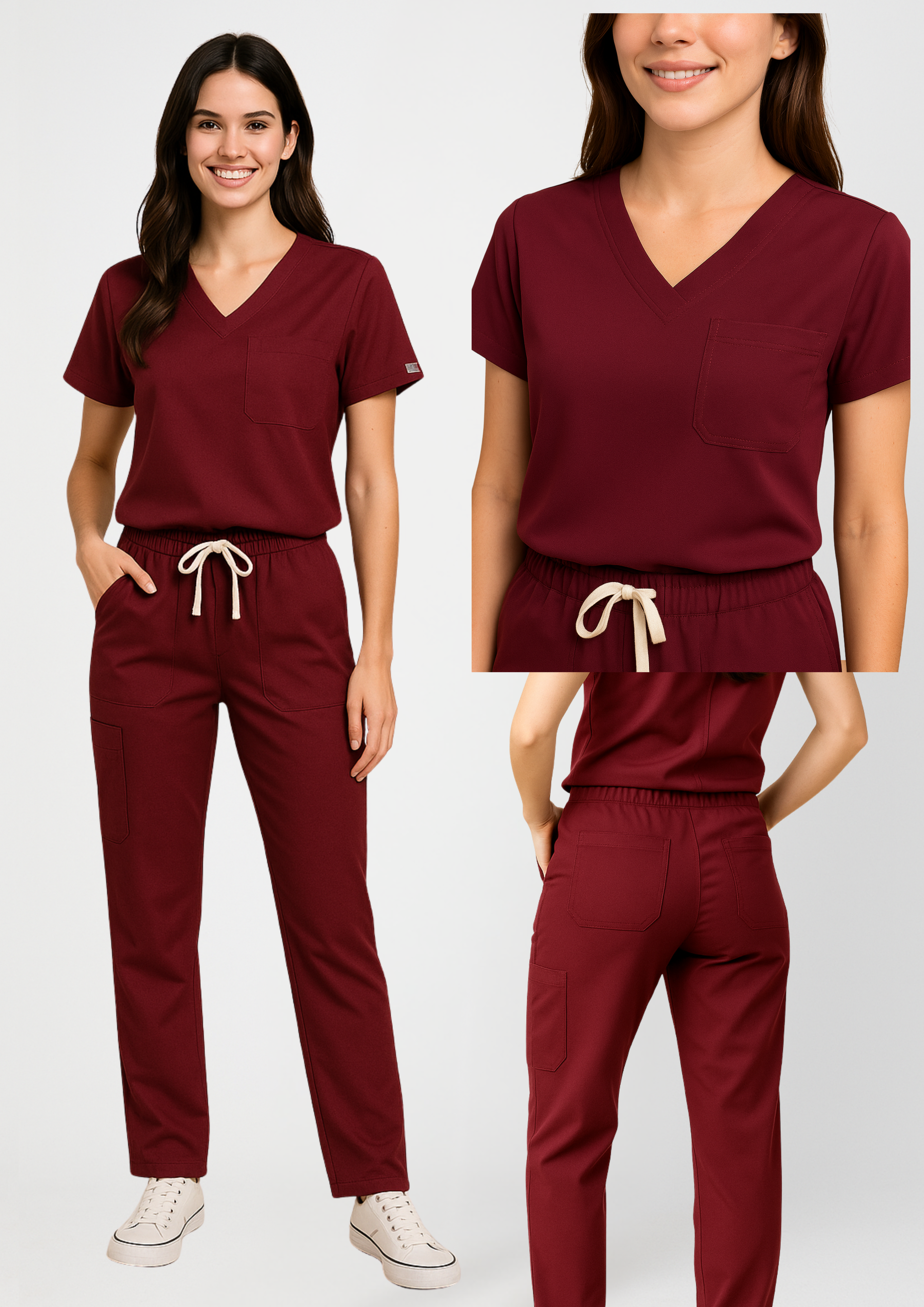 Scrub con blusa con cuello V cruzado, con bolsillo de pecho tipo parche y manga recogida. Pantalón con dos bolsillos laterales, un bolsillo en media pierna y dos bolsillos traseros. Cintura elástica con cordón.