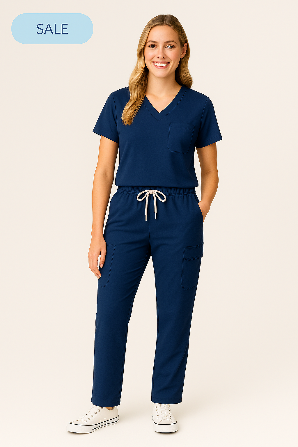Scrub con blusa con cuello V cruzado, con bolsillo de pecho tipo parche y manga recogida. Pantalón con dos bolsillos laterales, un bolsillo en media pierna y dos bolsillos traseros. Cintura elástica con cordón.