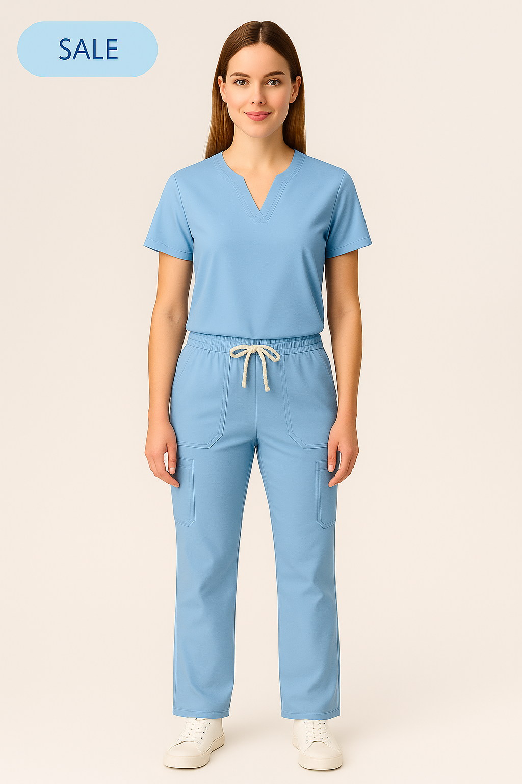 Uniforme con blusa de cuello V sin costuras, pantalón tipo cargo con cintura elástica, dos bolsillos laterales, dos bolsillos en media pierna con tapa tipo cargo, dos bolsillos traseros. Bota ancha.