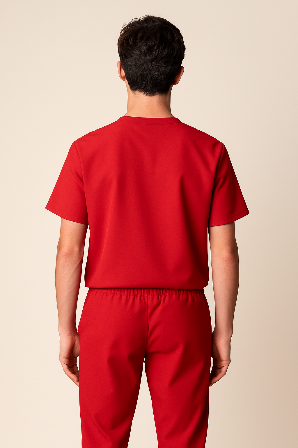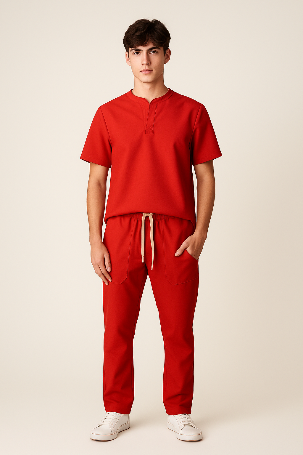 Scrub con camiseta con cuello tipo militar sin bolsillos, pantalón con dos bolsillos laterales con cintura recortada y cordón con puntas protegidas.