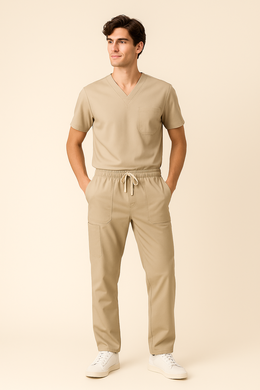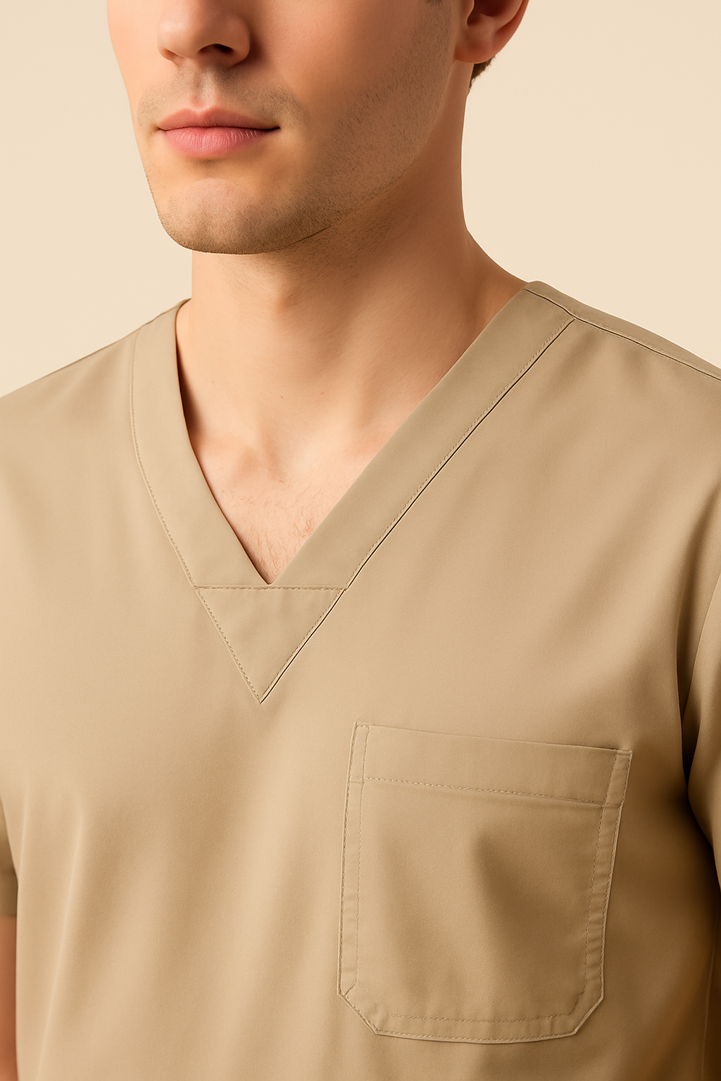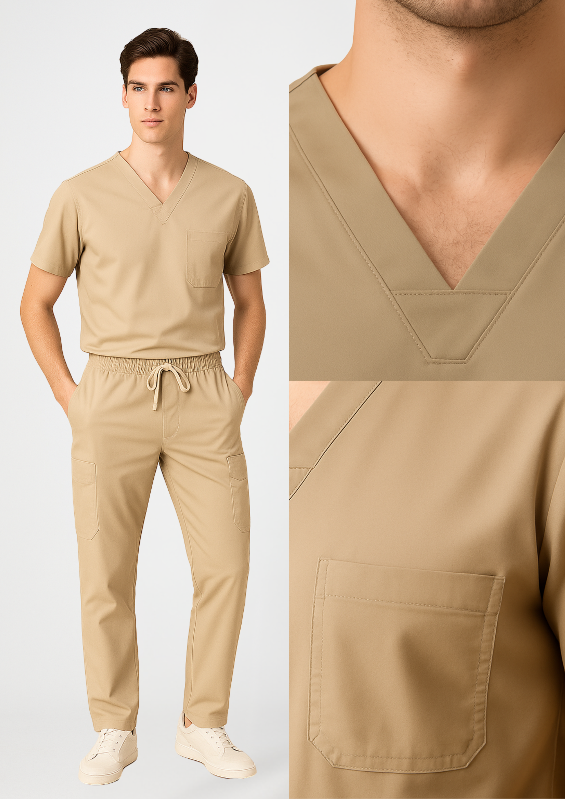 Scrub con camiseta cuello V con parche triangular con bolsillo en el pecho con sobrecostura para el esfero, pantalón con bolsillos laterales en tapa y en la media pierna con sobrecostura para el esfero.